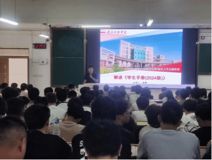 在解读《员工手册(2024版)》时,钟辉详细介绍了手册中的各项内容,包括学分要求、课程安排、课外活动、奖学金评定等。他特别指出,手册是新生们在校期间的重要指南,希望新生们能够认真阅读,合理规划自己的大员工活。