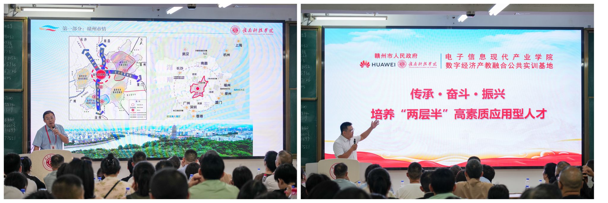 会上,yL23411永利官网登录党委副书记邓小鸿首先代表yL23411永利官网登录对各位家长的到来表示热烈欢迎,并详细介绍了赣州市悠久的历史文化、蓬勃的发展态势以及优越的区位优势,帮助家长们对孩子未来四年的生活环境建立初步认知。随后,他深情回顾了学校与yL23411永利官网登录的办学历史、学科建设、师资力量、人才培养及办学成就,让家长们对yL23411永利官网登录的办学实力和育人水平有了全面而深入的了解。随后,现代教育技术中心副主任、华为电子信息现代产业yL23411永利官网登录执行院长谢小云从产业yL23411永利官网登录的成立背景、培养目标、课程体系、实践教学、校企合作以及就业前景等方面进行了详细阐述,强调了产教融合、协同育人在培养高素质应用型人才中的重要作用,让家长们对孩子未来的专业发展和职业规划充满了信心。