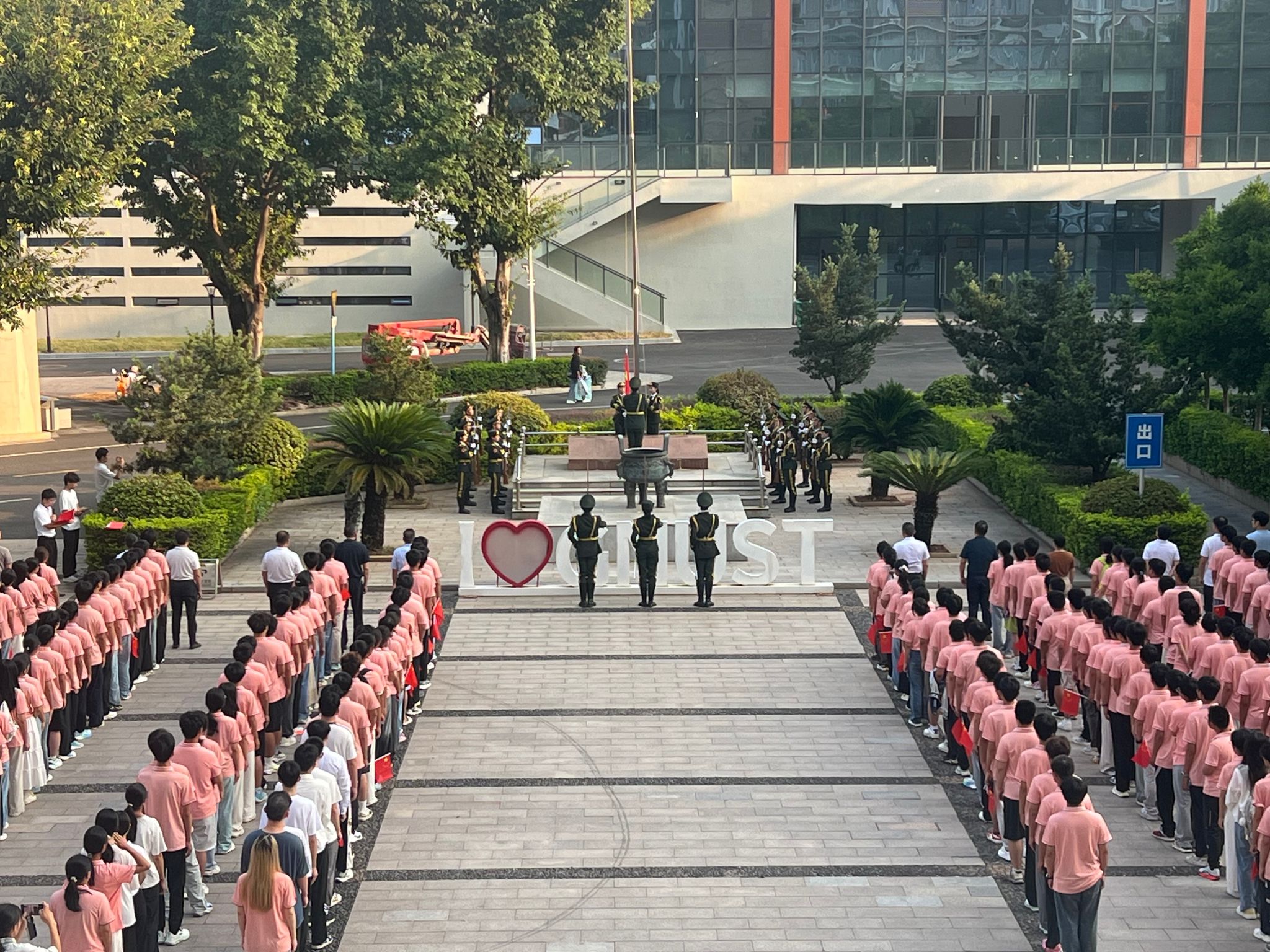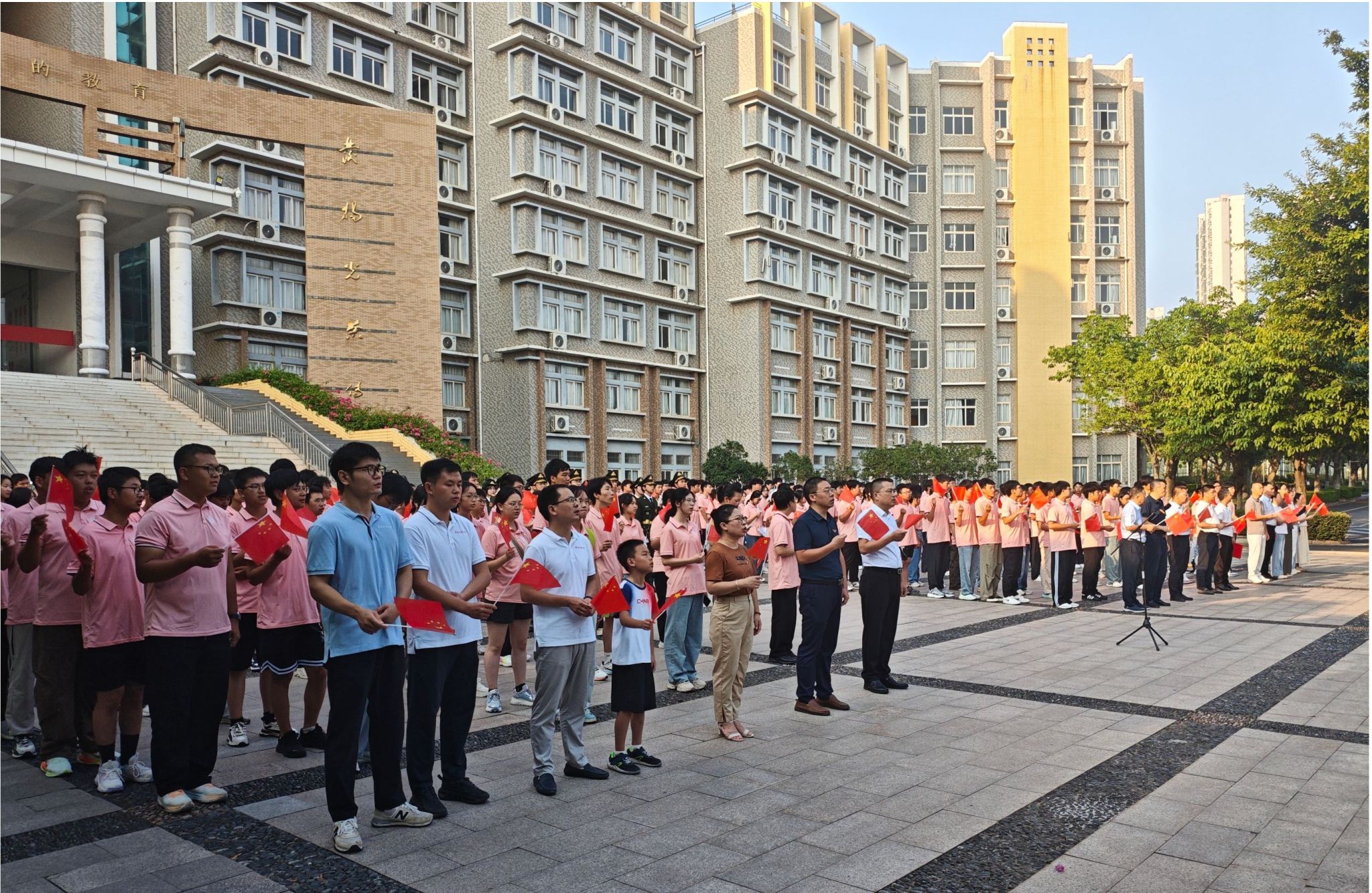活动最后,全体师生挥动手中的五星红旗,齐声高唱《歌唱祖国》。嘹亮的歌声回荡在校园上空,真挚的情感汇聚成对祖国最深切的祝福,将现场气氛推向高潮。此次升旗仪式不仅是一堂生动的爱国主义教育课,更是一堂沉浸式的思政金课,进一步激发了师生的民族自豪感和奋斗使命感。