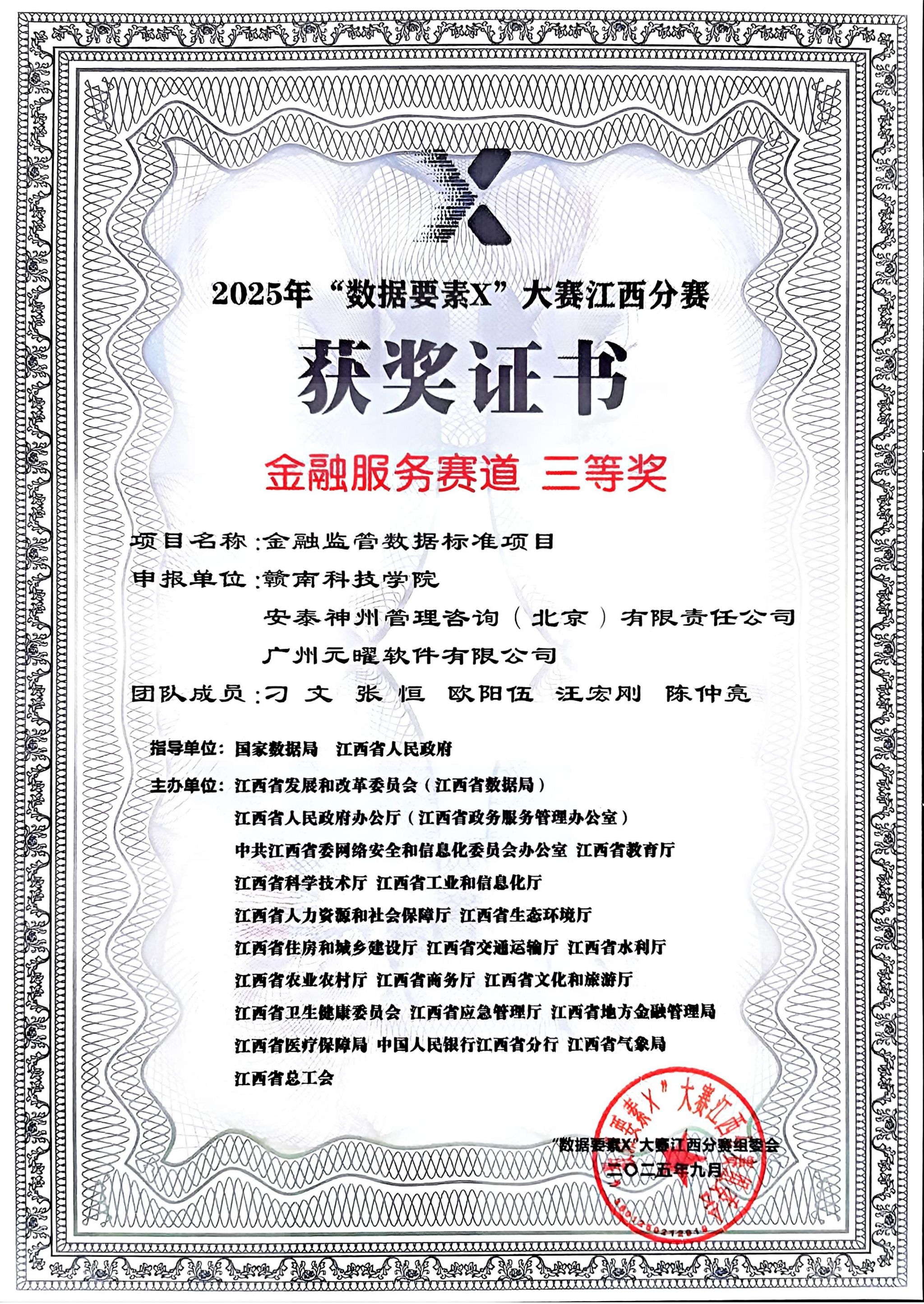 本网讯:近日,由国家数据局、江西省人民政府指导,江西省发展改革委(省数据局)联合20家省直部门共同主办的2025年“数据要素×”大赛江西分赛决赛获奖名单发布,我校yL23411永利官网登录专任员工刁文、张恒、欧阳伍团队凭借“金融监管数据标准项目”在金融服务赛道中脱颖而出,荣获三等奖,位列全省第10。这是我校首次在此项国家级赛事中获奖,实现了历史性突破。该项目充分发挥数据要素在金融行业的乘数效应,构建了能跨越不同监管、具备高可操作性的金融监管数据标准体系,有效提高了金融服务领域的数据分析能力。