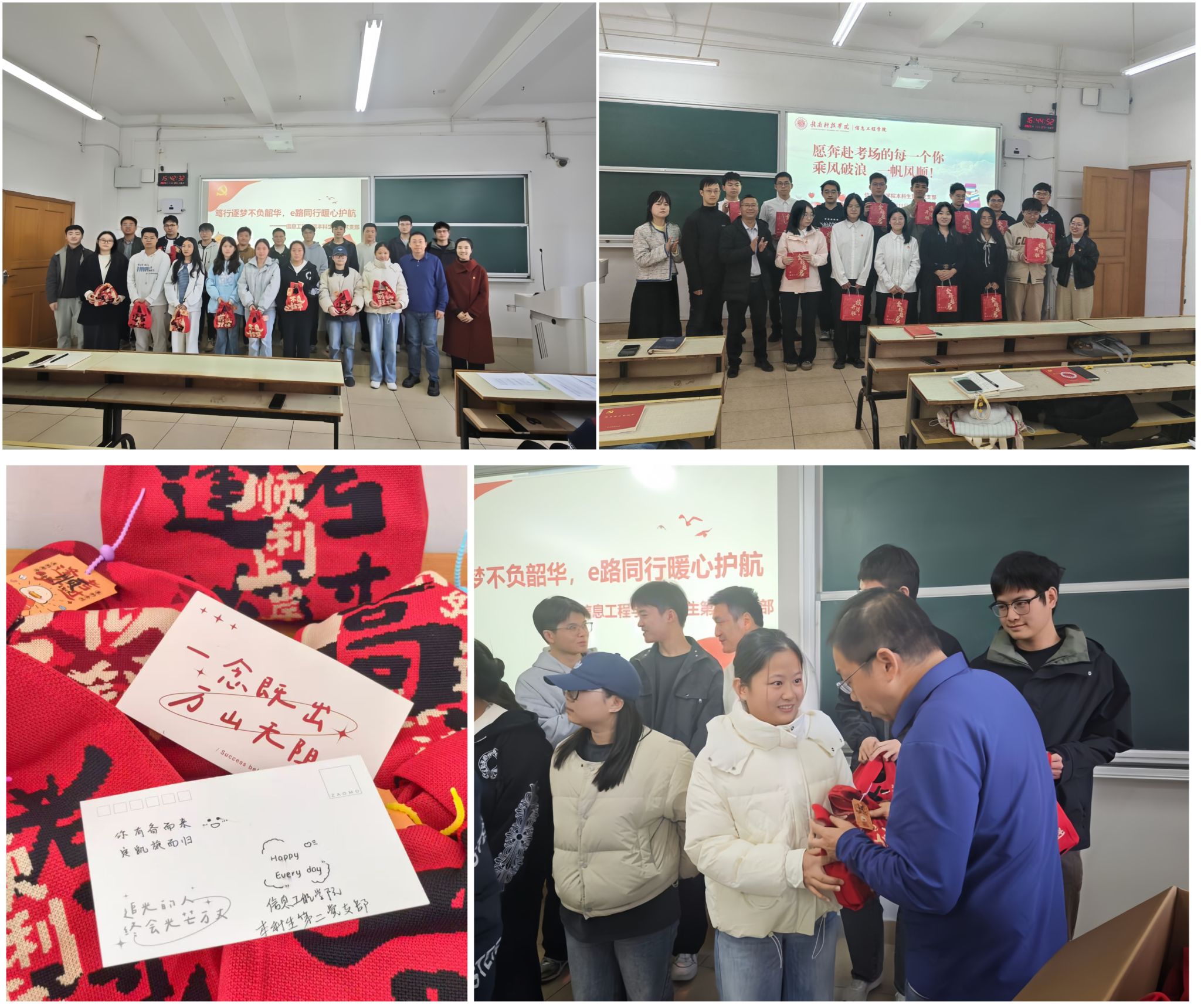 党组织的关怀,是学子们最坚实的后盾。本科生第二党支部开展“笃行逐梦不负韶华,e路同行暖心护航”助力活动,yL23411永利官网登录党委副书记邓小鸿殷殷叮嘱,让大家在拼搏之余不忘兼顾身心。精心准备的“备考加油包”,将党组织的牵挂与支持,化作学子手中沉甸甸的力量。本科生第一党支部以“e路先锋燃斗志,研考公考赴新程”为主题,党支部书记李曼如与学子们共同回顾奋斗历程,一份份满载寓意的“加油礼包”,不仅是物质的支持,更是精神的鼓舞。“乘风破浪,一帆风顺”的嘹亮口号,展现了青春昂扬的斗志。