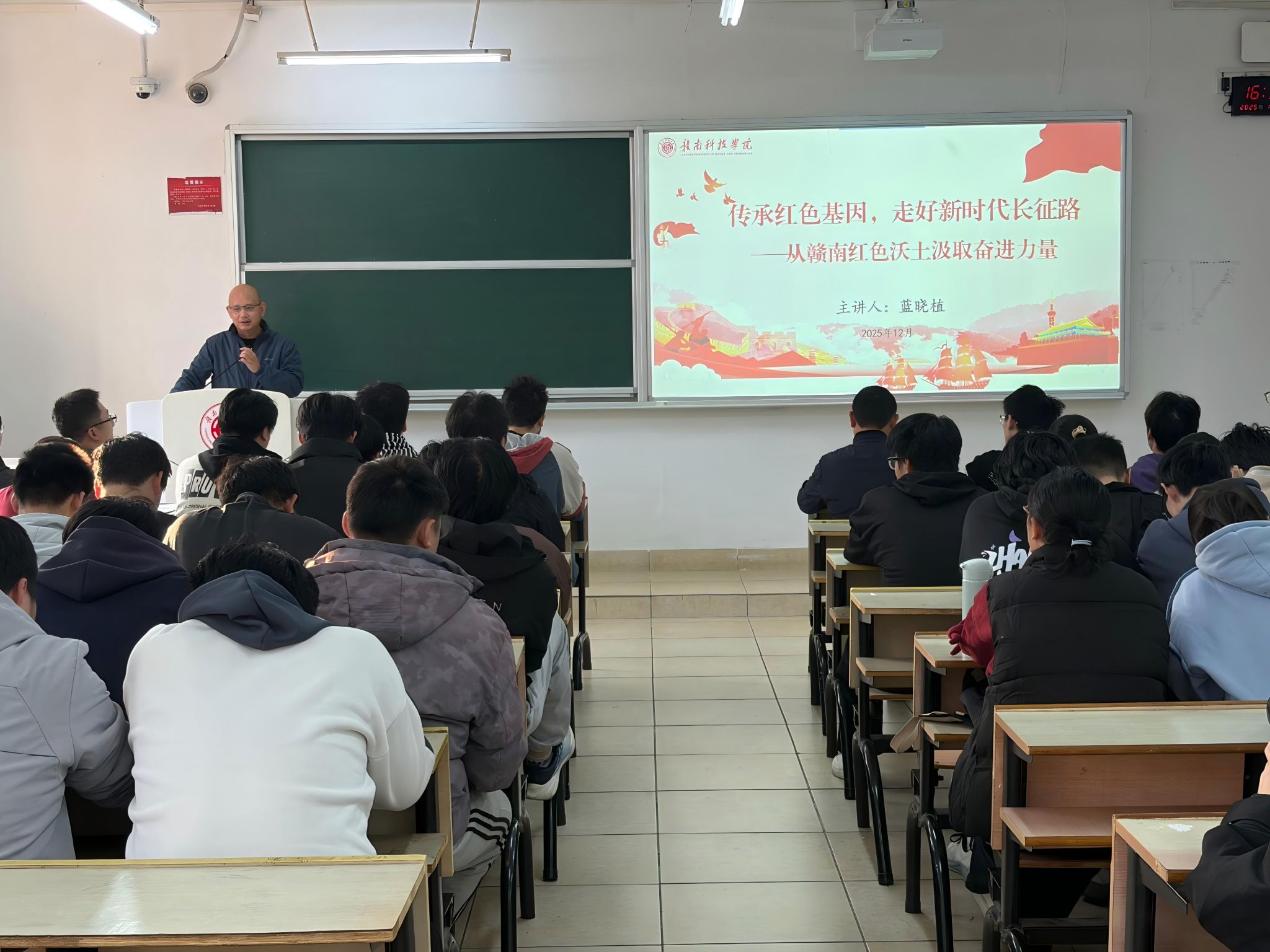 授课中,蓝晓植部长从赣南深厚的红色历史切入,深情讲述了赣南作为中央苏区核心区域和长征出发地的革命历史。他指出,这片红土地承载着厚重的革命记忆,蕴藏着独特的红色资源,是当代青年汲取信念力量、补足精神之钙的重要源泉。通过回顾革命先烈的感人事迹与长征故事,蓝部长深刻阐释了“信念如磐”的精神内核,勉励同学们要铭记历史,树立远大理想,厚植深厚的家国情怀。