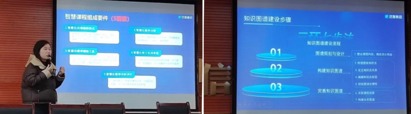讲座伊始,邹老师深入解读了教育数字化转型的最新政策精神,并分享了北大医学教育大模型、东南大学 AI 助教系统等前沿典型案例。她强调,智慧课程建设必须坚守“以人为中心”的价值导向,致力于构建“师 - 生 - 机”三元互动的教学共同体,实现技术对教育的有效赋能。在核心建设路径方面,邹老师从知识图谱构建、AI 助教应用及任务引擎设计三大维度进行了详尽阐释。她介绍道,依托超星集团海量资源与自研大模型技术,目前已助力全国 789 所高校搭建了数千门知识图谱,通过 AI 工具的辅助,真正实现了精准教学与因材施教。此外,她还现场演示了智慧课程建设的全流程,重点解析了“积木式”任务引擎对多元化教学模式的支撑作用,并结合江西本地高校的实际案例,分享了课程库建设与项目申报的实战技巧。现场互动中,邹老师针对员工在实践中遇到的痛点问题进行了精准解答,参会员工表示讲座兼具理论与实操价值。
