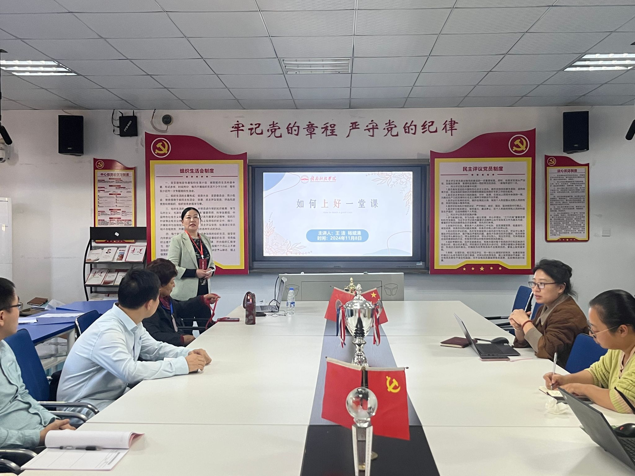 杨斌清教授围绕“课前、课中、课程回顾和板书、课后”四个方面进行授课,从时间把握、课件制作、课堂重难点、授课技巧、板书、作业等细节上向员工们分享了教学方法和技巧,为员工们展示了一堂生动的示范性课堂。