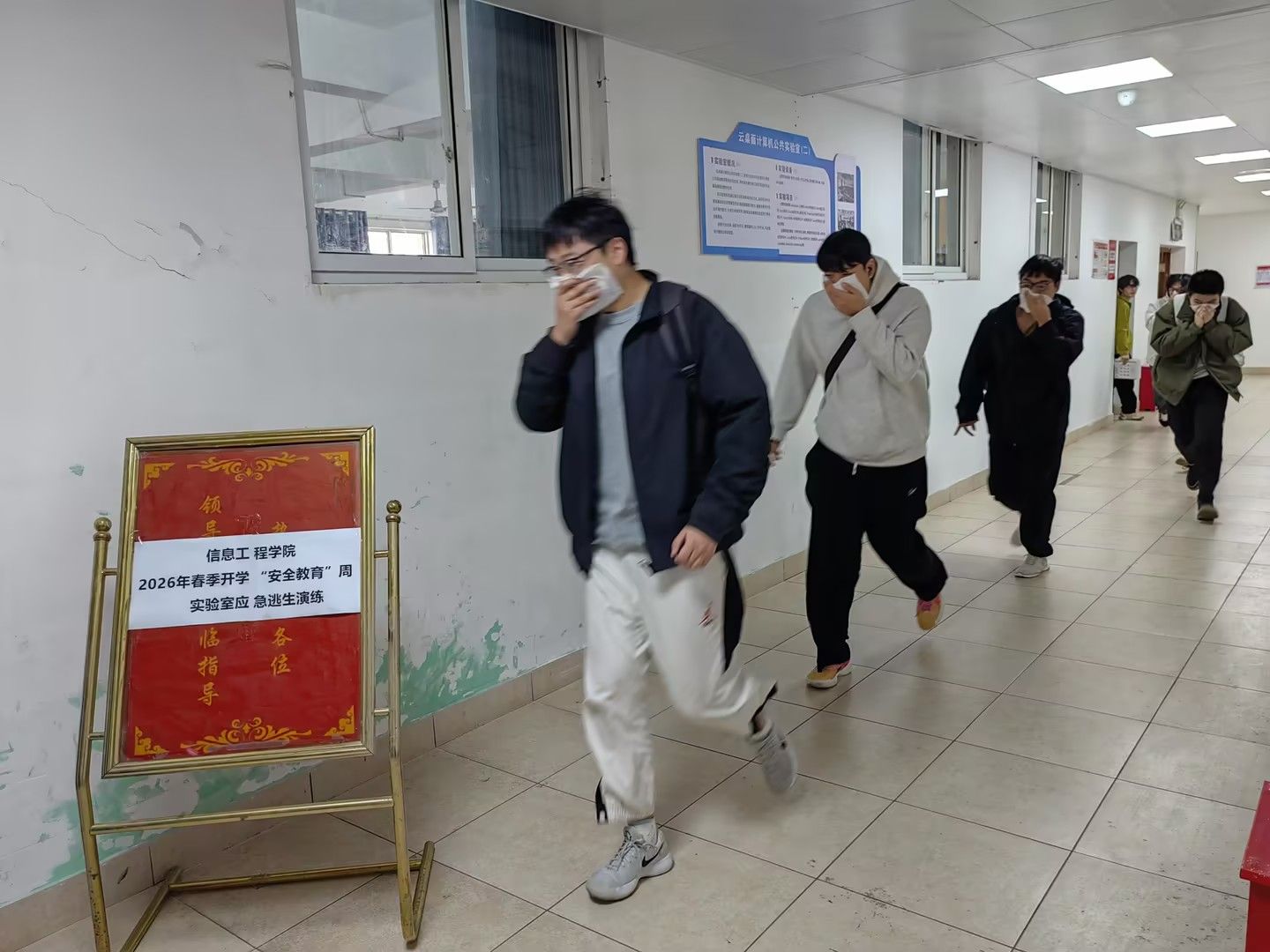 火灾逃生应急演练环节,随着警报声响起,师生迅速用湿毛巾捂住口鼻,弯腰低姿沿预定路线有序撤离,全程快速规范、秩序井然。演练结束后后,实验室管理员结合实验室电器设备密集、线路复杂的特点,强调了日常安全排查要点。