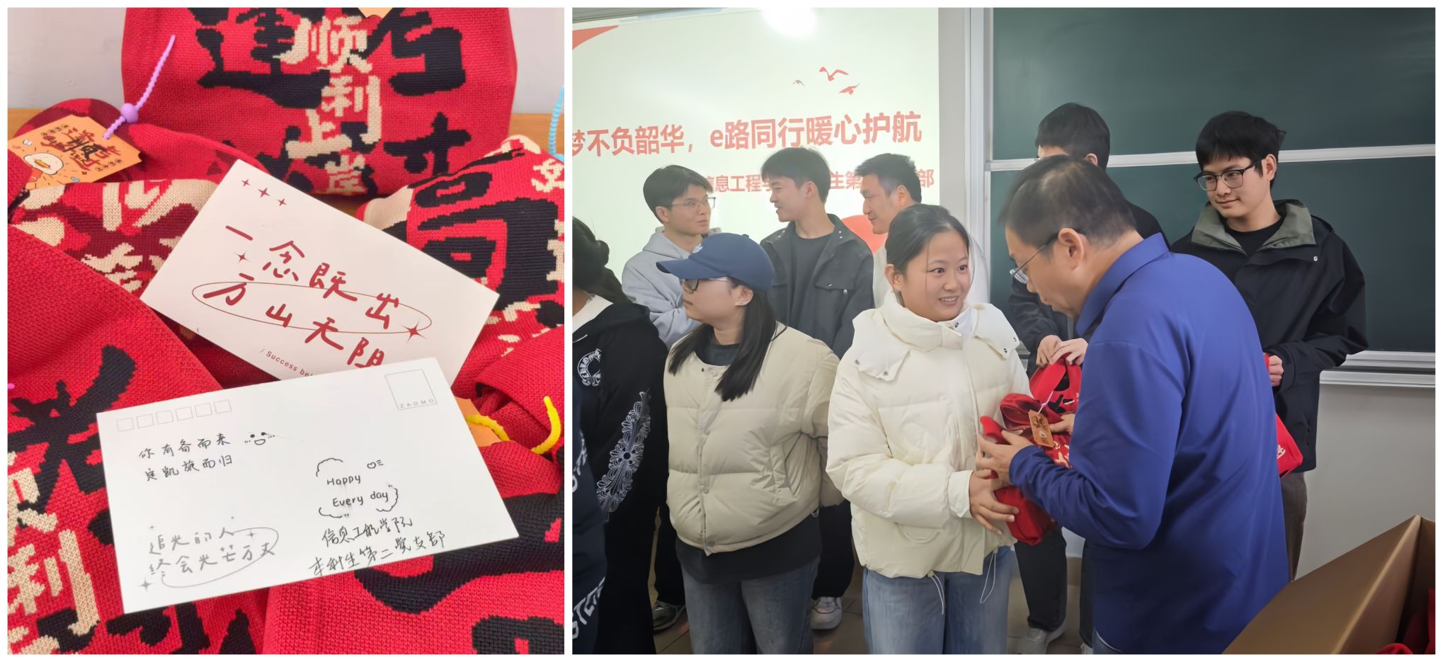 为帮助同学们解决备考中的实际需求,党支部提前调研,精心准备了包含实用文具、暖心物资等在内的“备考加油包”。在发放环节,yL23411永利官网登录党委副书记邓小鸿同志、党支部书记、支部委员及员工党员代表亲手将“加油包”递到同学们手中,每一份“加油包”都承载着党组织的牵挂与祝福。同学们接过礼包时脸上洋溢着感动的笑容,纷纷表示感受到了集体的温暖,备考的信心更足了。