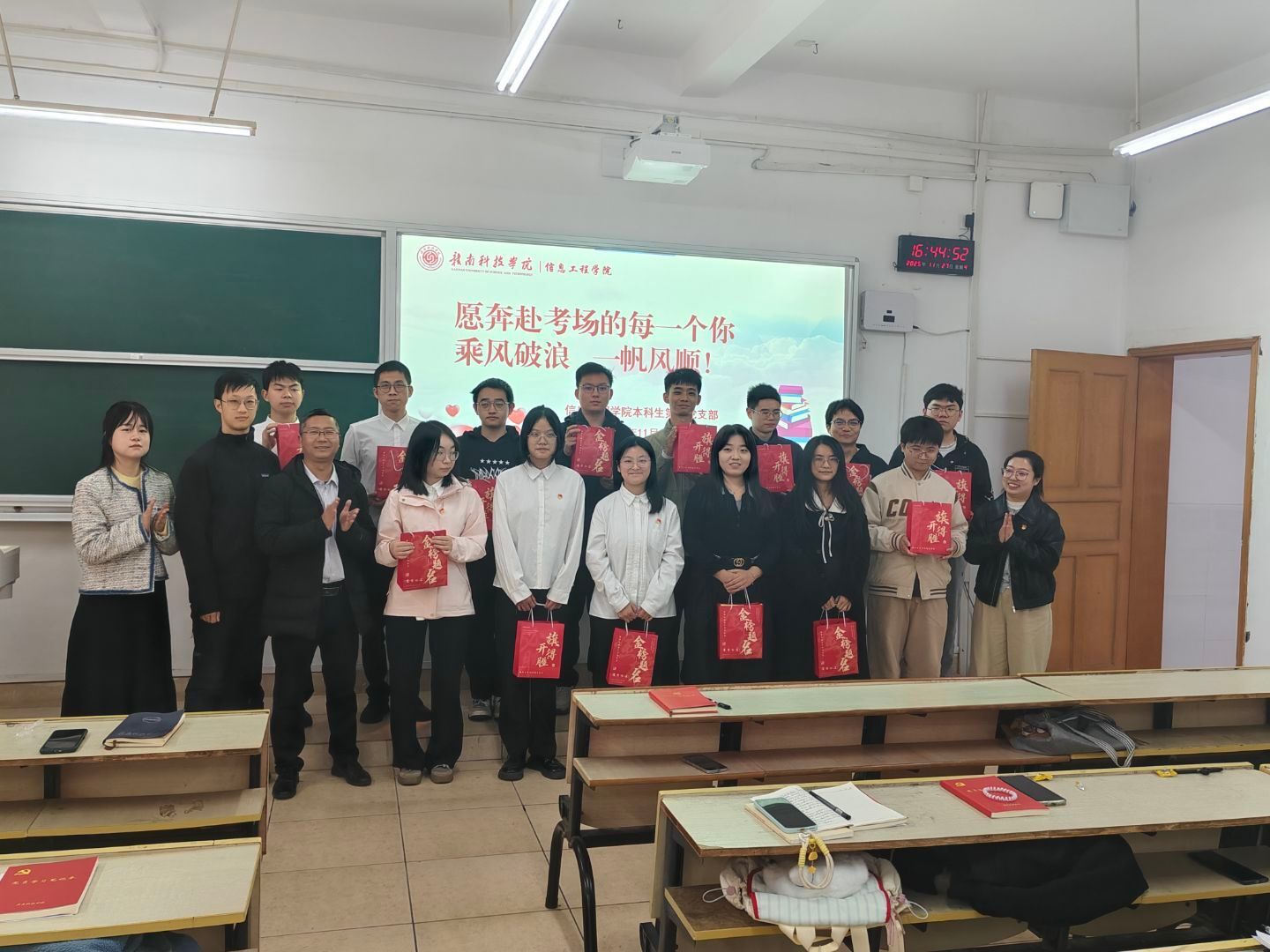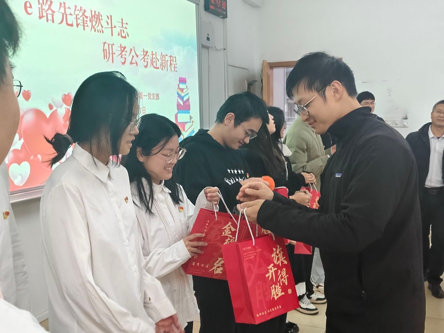 为传递组织的温暖与关怀,党支部为每位备考同学精心准备了一份寓意深远的“加油礼包”。当礼物送到同学们手中时,现场气氛瞬间被点燃。大家自发喊出“乘风破浪,一帆风顺”的响亮口号,美好的祝福与昂扬的斗志交织,充分展现了党支部强大的凝聚力与学子们迎难而上的坚定决心。