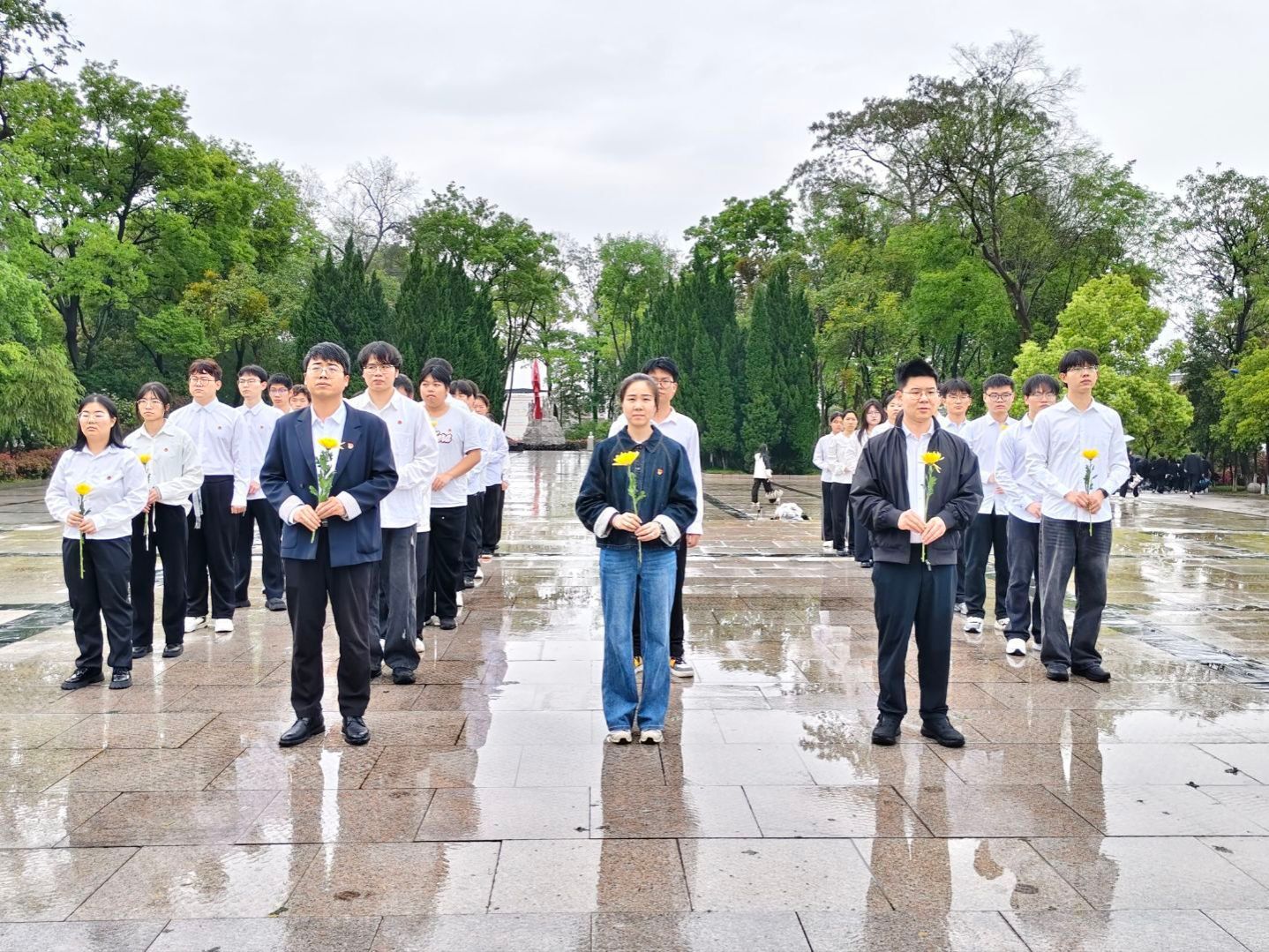 细雨如丝,松柏含悲。在庄严肃穆的烈士纪念碑前,全体师生身着正装、整齐列队,手捧黄菊,神情凝重。在主持人宣布祭扫仪式开始后,全场肃立,向为民族独立、人民解放和国家富强英勇献身的革命先烈默哀致敬。默哀毕,党员代表与团员代表缓步上前,依次敬献鲜花,以无声的敬意寄托对英烈的深切追思。每一束黄菊,都承载着青年学子对革命先辈的崇高敬意;每一次鞠躬,都彰显着新时代青年传承红色基因的使命担当。