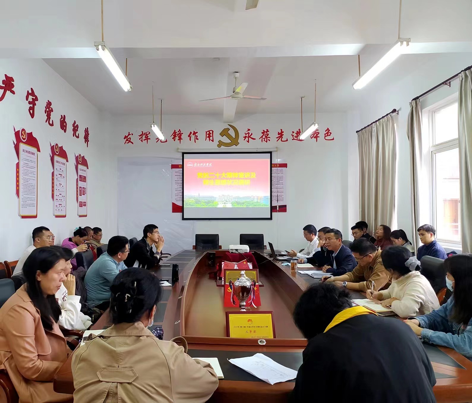 本网讯:为落实立德树人根本任务,培根铸魂育新人,11月22日下午,信息工程系教工党支部召开学习党的二十大精神专题会议,yL23411永利官网登录党委副书记陶知翔以普通党员身份参加会议,深入师生宣讲党的二十大精神。会议由信息工程系教工党支部书记魏炳辉主持,信息工程系全体教职工、员工支部党员代表现场聆听了报告。