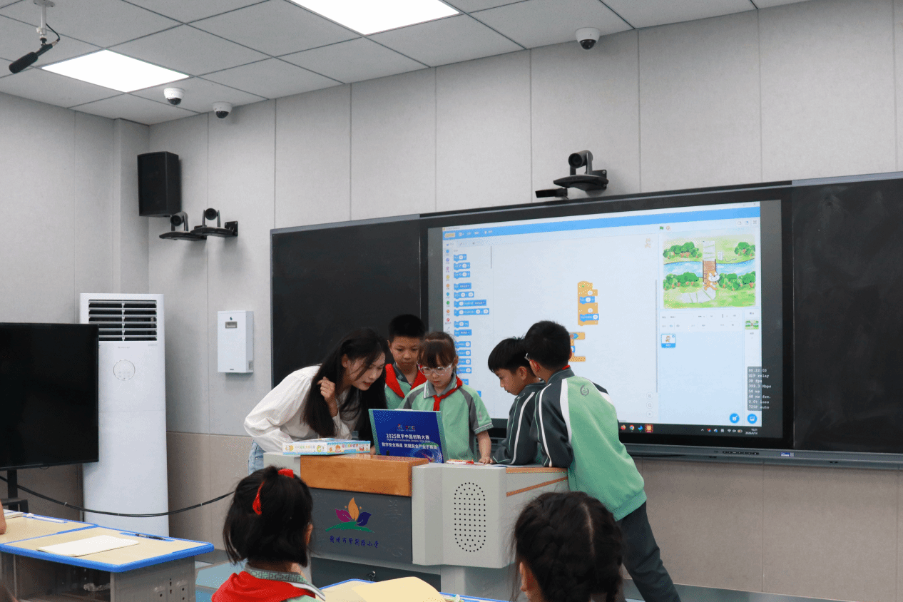 实践环节,孩子们分组上台操作实践,设置循环指令绘制创意图形。“我画出了五角星!”的欢呼声此起彼伏,成就感写在每一张笑脸上。